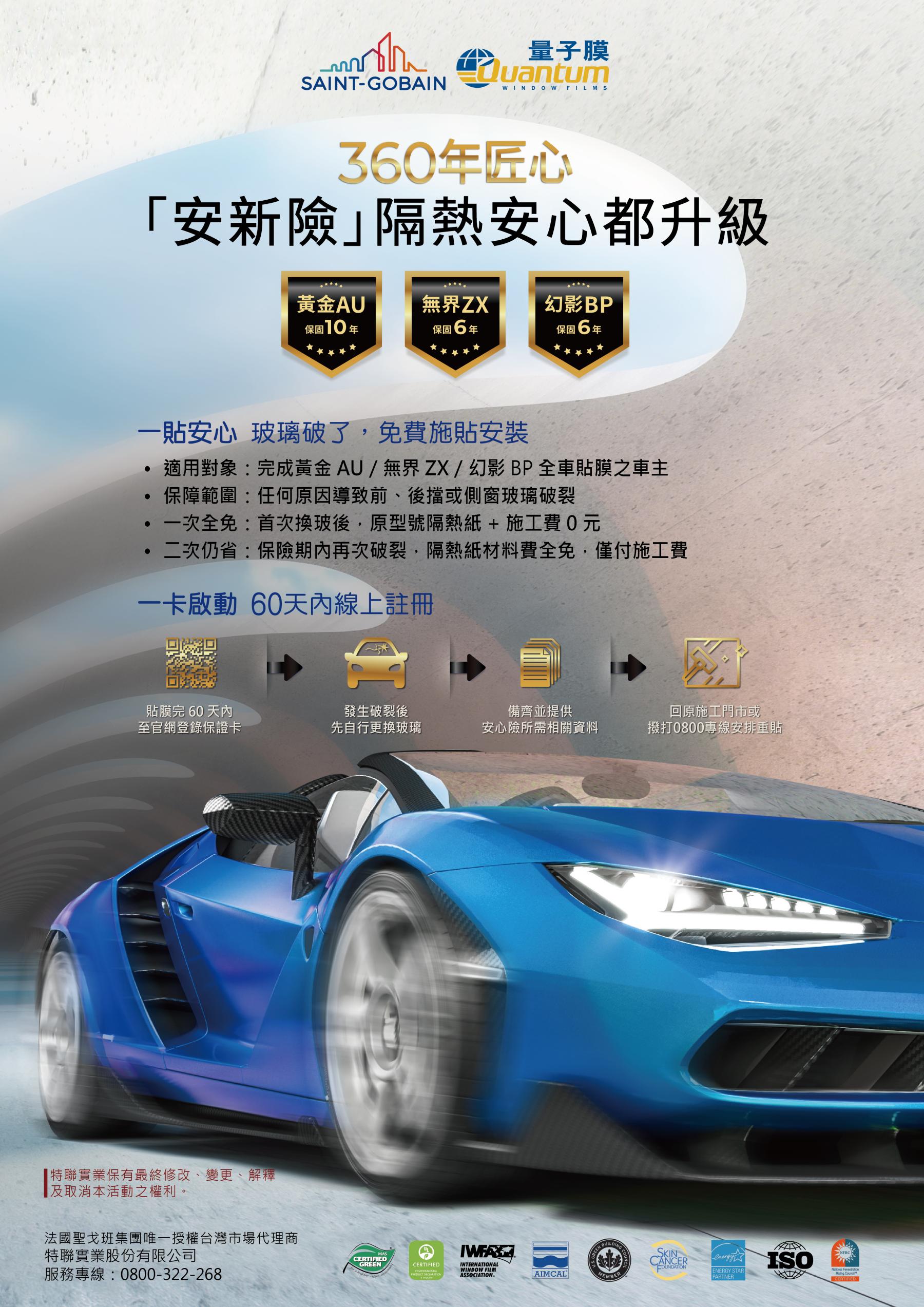 在安新險期間內,若您的愛車玻璃破裂並更換玻璃後,即可免費補貼「相同型號」隔熱紙乙次!